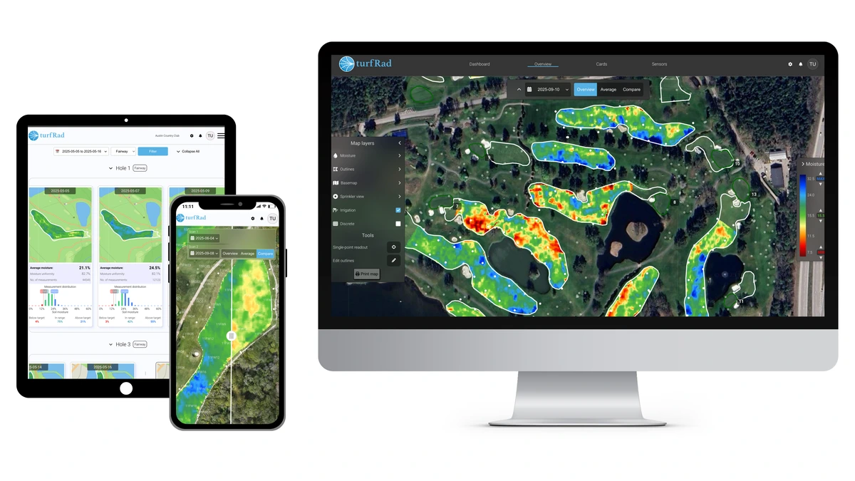 The turfRad is an advanced soil moisture mapping solution that helps golf course superintendents optimize playing conditions and conserve natural resources. It ends the guesswork. Using patented L-band microwave technology (miniaturized from space agency satellites), turfRad collects thousands of high-resolution, root-zone measurements from your existing mowers, providing actionable insights with zero extra labor.